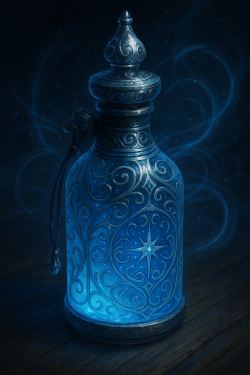 Quest’olio magico, dal caratteristico colore azzurro e filamenti brillanti, può essere utilizzato secondo due modalità (chi lo usa deve scegliere con quale modalità utilizzarlo). Con la prima modalità lo stesso permette di eliminare gli effetti di breve periodo collegati al cumulo di lesioni spazio/temporali (link). Quando ciò avviene potranno utilizzarsi da una a tre dosi annullandosi con ognuna di esse gli effetti di uno degli eventuali tiri salvezza che la stessa aveva fallito. All'interno di un singolo periodo di flusso di energia divina, una creatura può utilizzare validamente questo olio magico una sola volta (indipendentemente dalle dosi usate). La seconda modalità permette di provare ad eliminare le lesioni spazio/temporali che la creatura toccata aveva subito a causa di effetti di tipo dimensionale. In particolare, utilizzando una dose di questo olio, la vittima avrà una possibilità pari ad una percentuale ottenuta sommando i propri punteggi di vigore, psiche, e vitalità di annullare fino a tre lesioni subite fino a quel momento. Una diversa prova percentuale sarà effettuata per ogni singola lesione. Questi tiri percentuali non possono essere modificati utilizzando punti fato o prove di tenacia. Indipendentemente dal risultato dell'applicazione, una creatura non potrà applicare validamente questo olio sul proprio corpo prima che siano trascorsi 30 giorni dal momento precedente in cui lo stesso è stato usato. Si noti che i limiti temporali previsti da questo olio magico sono diversi da quello della magia Restoration of the Continuum (l'utilizzo dell'uno non impedisce l'uso dell'altro e viceversa). Un singolo contenitore di questo olio contiene cinque dosi. |