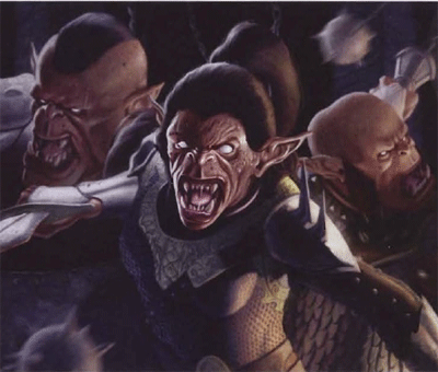 La storia di questa razza è oscura e si perde nei meandri del tempo. Infatti, essendo stata tramandata dai diretti interessati principalmente in modo orale, tutto ciò che si sa sulla storia degli hobgoblin deriva principalmente dalla descrizione che le cronache dei popoli con cui essi sono entrati in contatto danno di loro. Nessuno storico del mondo civile ha mai osato organizzare spedizioni nelle pericolose cittadelle dell'est o dell'ovest del Nordor per chiedere ai goblinoidi maggiori informazioni rispetto alle lacune che si hanno sugli eroi della tradizione della loro razza. Unica eccezione a questo stato di ignoranza e di lacuna culturale in cui, del resto, anche gli altri umanoidi sono immersi. Società Gli hobgoblin sono i cugini più grossi e robusti della famiglia goblinoide. A differenza dei goblin, gli hobgoblin tendono a riunirsi più in cittadelle fortificate che in villaggi tribali, in quanto la forza superiore di queste creature permette loro, se non di prosperare tra gli umanoidi, per lo meno di ritagliarsi il proprio spazio vitale sul territorio. In tali cittadine gli abitanti sono spesso un misto di hobgoblin, goblin e bugbear, anche se solo i primi tendono a occupare posizioni di rilievo all'interno dei ranghi sociali. In effetti una caratteristica tipica della società degli hobgoblin è l'emarginazione e la sottomissione dei più deboli. Salvo rarissimi casi, difficilmente i goblin riescono a farsi rispettare agli occhi dei loro consanguinei maggiori, se non per straordinarie doti di utilizzatori di magie con le quali riescono a ritagliarsi una piccola fetta di notorietà. In effetti, nelle cittadelle fortificate hobgoblin non è rara la formazione di veri e propri ghetti abitati esclusivamente da goblin, i quali ricreano le loro strutture tribali in tali acquartieramenti da costoro occupati. Gli hobgoblin sono capaci allevatori di bestie atte alla guerriglia e spesso si portano dietro sul campo di battaglia lupi od altre bestie da loro allevate ed addestrate alla guerra ed alla violenza. Psicologia Gli hobgoblin vivono in una società militare e sono fieri del loro status di guerrieri, del loro potere sul campo di battaglia e della fattura delle loro armi. La guerra ed, in particolare, la razzia è la loro ragione di vita ed essere un grande guerriero è la maggiore aspirazione che un hobgoblin possa avere. La violenza pervade lo spirito degli Hobgoblin. Infatti, si tratta di una razza molto aggressiva, anche con i propri simili, e, qualora due bande o fazioni differenti si scontrano, c'è una forte probabilità che tale situazione degeneri in uno scontro verbale o fisico a meno che non sia presente un rappresentante così potente e temuto da riuscire a tenere a bada i soggetti inferiori coinvolti. È altresì noto che gli hobgoblin si considerano superiori alle altre razze, e spadroneggiano tra gli altri goblinoidi prendendo il sopravvento ogni volta che ne hanno l'occasione. Inoltre, gli hobgoblin provano un insano astio nei confronti degli umani e dei semi-umani preferendo normalmente la compagnia di altri umanoidi. Questo rancore è causato da da secolari scontri e guerre di confine nei quali i cosiddetti "popoli civilizzati" hanno decimato e spossessato gli hobgoblin dei loro possedimenti. Umani e dei semi-umani, inoltre, sono soliti trattare gli hobgolin come, del resto, tutti gli altri umanoidi con grande superiorità bollandoli come esseri inferiori e selvaggi. A questo atteggiamento un hobgoblin non può che rispondere con la violenza e la brutalità dimostrando in tal modo la sua superiorità. |