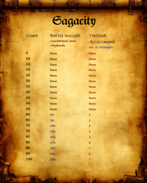 Surprise Modifier: La saggezza rappresentando anche la capacità di mantenere sangue freddo incide, parimenti al modificatore del Reaction Adjustment applicato in base al punteggio di destrezza posseduto, sulla possibilità di essere sorpresi da eventi repentini ed inaspettati. Tale modificatore, dunque, andrà applicato alla prova sulla sorpresa effettuata dai personaggi (link).