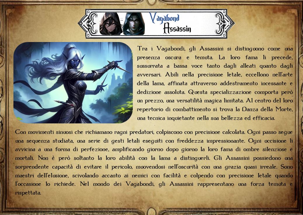Gli assassini conoscono un modo di combattere unico, letale e allo stesso tempo coreografico che è caratterizzato da ondeggiamenti sinuosi del corpo e contraddistinto dall'alternarsi di movimenti molto lenti e scatti fulminei ed improvvisi. La bellezza di questa danza di morte è quasi ipnotica per i profani che si rendono conto che questi movimenti simulano quelli che i ragni effettuano quando attaccano la loro preda. Costoro acquistano gratuitamente la competenza non relativa alle armi "Dancing". Si noti però che non trattandosi di una speciale danza marziale legata al combattimento in deroga alle comuni regole non si potrà applicare il bonus a questa prova nella competenza non relativa alle armi eventualmente posseduto per alti punteggi di intelligenza. Questo metodo di combattimento può essere utilizzato solo impugnando due armi di cui la secondaria sia necessariamente un pugnale. Inoltre, costui non può indossare corazze appartenenti alle categorie delle corazze metalliche snodate, corazze metalliche rigide e corazze metalliche rigide pesanti, o corazze ad esse equivalenti, fatta eccezione per la Elven Chain Mail. Questo metodo di combattimento è incompatibile con qualsiasi altro stile od equilibrio particolare. L'Assassino può provare ad entrare in posizione di Danza di Morte in ogni momento nel corso del combattimento. Questo tentativo, che si risolve come prima azione nella fase delle intenzioni da effettuarsi prima del tiro delle iniziative, ha natura di free action che comporta una penalità di +25 al fattore iniziativa delle successive azioni (+30 se l'Assassino fa parte di una classe multipla o duale), e necessita del superamento di una prova nella competenza "Dancing" con penalità di -2 (o di -3 se l'Assassino ha aumentato il proprio movimento a partire dall'inizio del round in corso ad esempio con la competenza Running o con l'uso di oggetti magici od incantesimi che non impediscano il compimento di azioni complesse). Si noti che questa danza può essere compatibile con l'uso della competenza non relativa alla armi "Sprint" la quale non essendo effettuata all'inizio dell'azione di danza non imporrà alcuna penalità alla prova di Dancing ma qualora utilizzata per estendere il movimento di danza marziale si vedrà imposta una penalità di -2. Inoltre, quando l'Assassino prova ad assumere il regime di Danza di Morte ha il 30% di possibilità di accumulare un punto fatica supplementare (40% se l'Assassino fa parte di una classe multipla o duale) rispetto a quello comunemente accumulato nel round in corso. L'Assassino dovrà applicare regolarmente alla prova di "Dancing" tutte le penalità dovute al terreno, all'illuminazione ed allo stato di combattimento). Se la prova fallisce, l'Assassino non avrà assunto la posizione potendo, quindi, effettuare un nuovo tentativo solo all'inizio del successivo round di combattimento. Se la prova riesce, invece, l'Assassino sarà entrato nel regime di Danza di Morte e potrà utilizzarne da subito i benefici. All'inizio di ogni nuovo round di combattimento, prima del momento della dichiarazioni delle intenzioni, costui potrà uscire volontariamente da tale posizione o provare a continuare a mantenere la posizione di Danza di Morte con una nuova free action che comporta una penalità di +10 al fattore iniziativa delle successive azioni e richiede il superamento una nuova prova di Dancing con penalità di -1 (o di -2 se l'Assassino ha aumentato il proprio movimento) ed il 20% di possibilità di accumulare un punto fatica supplementare (30% se l'Assassino fa parte di una classe multipla o duale) nel round in questione. |