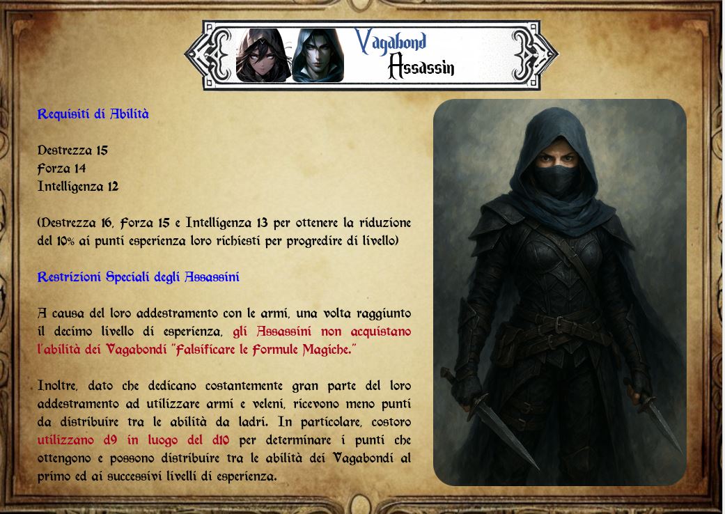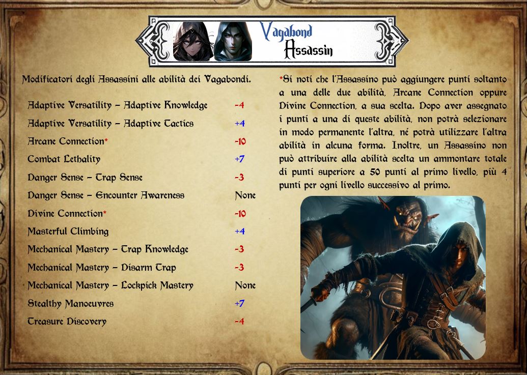Le seguenti regole sono state ideate per rendere più versatile, differenziata e divertente la classe dei ladri (thief) attraverso l'inserimento di una serie di talenti speciali a cui hanno accesso, unicamente alla loro creazione, i personaggi. Ciò può avvenire con due diverse modalità: a) Scelta di un talento speciale Alla fine della creazione di un personaggio che appartenga alla classe rogue (ladri e cantori) il giocatore può utilizzare 4 punti creazione (sempre che gli siano rimasti) per ottenere un talento speciale (un solo talento può essere acquisito in questo modo). Il giocatore quindi potrà scegliere la sottoclasse dalla quale poi si selezionerà a sorte (con il tiro di 1d20) il talento che costui avrà acquisito. b) Appartenenza ad una sottoclasse di ladri In alternativa, solo i personaggi della classe di ladri (thief) potranno decidere di appartenere ad una delle seguenti sottoclassi di ladri (sempre che ne abbiano i requisiti minimi) ottenendo tutti i benefici e le limitazioni previste dalla stessa. Gli appartenenti a tali sottoclassi saranno considerati comunque della classe thief, seguiranno però una diversa, specifica, tabella dei punti esperienza. |