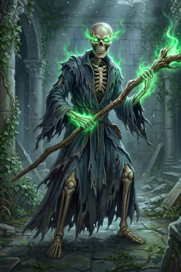 Sebbene la sua struttura sia simile a quella di un comune scheletro, le sue ossa non sono bianche, ma hanno la densità e il colore dell'avorio invecchiato, quasi vitrificato da secoli di magia oscura. Ciò che vi gela il sangue, però, è il suo sguardo: le cavità orbitali non sono vuote, ma arondono di un sinistro bagliore verdastro, una nebbia spettrale che pulsa di un'intelligenza malevola e centenaria. La creatura indossa i resti di una tunica da mago un tempo sfarzosa, ora ridotta a un ammasso di drappi logori e polverosi che sembrano fluttuare seguendo correnti invisibili. Nella mano scheletrica stringe una staffa di legno nodoso e rovinato, i cui solchi naturali si illuminano di venature smeraldine. Sulla sommità del bastone, una fiamma di energia negativa verde sibila silenziosa, irradiando un freddo che non morde la pelle, ma l'anima stessa.